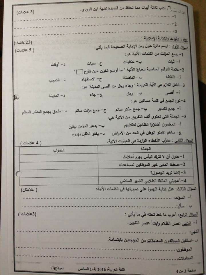 بالصور نموذج B وكالة اختبار اللغة العربية النهائي للصف السادس الفصل الاول 2018 منتدى معلمي الاردن